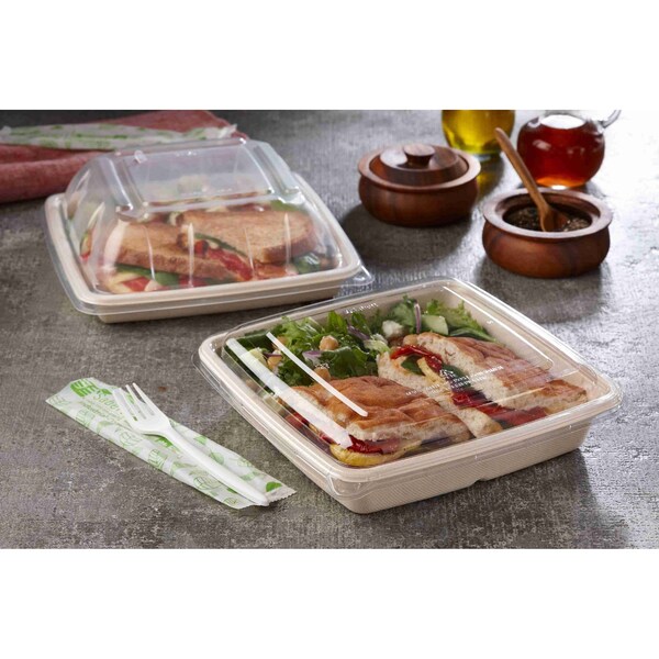 This clear square container lid is designed to fit 32 and 48 ounce containers. It features a transparent design allowing easy content identification. Made from durable PET material, it provides a secure fit to maintain freshness and prevent spills. The lid’s square shape complements compatible containers, making it suitable for food storage and transport. Its sturdy construction supports stacking and efficient space use. Ideal for commercial and personal use, this pack of 300 ensures reliable coverage and compatibility with Sabert containers of specified sizes.