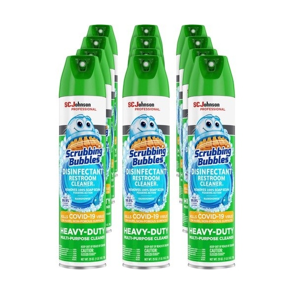 Scrubbing Bubbles Disinfectant Restroom Cleaner kills 99.9 percent of viruses and bacteria on hard, nonporous surfaces when used as directed. It kills SARS-CoV-2, Herpes Simplex Virus Type 1, Herpes Simplex Virus Type 2, Influenza A H1N1 Virus, Respiratory Syncytial Virus, Rotavirus, Staphylococcus aureus, Salmonella, Pseudomonas aeruginosa, E. coli and MRSA. Heavy-duty cleaner removes 100 percent soap scum while leaving behind a brilliant shine. Foaming action easily removes lime scale, calcium, rust and dirt. Gentle solution cleans, shines and freshens without harsh fumes. Disinfectant cleaner is perfect for tubs, shower walls, vinyl surfaces, shower doors, sinks, stainless steel, chrome fixtures, glass, laminate and more.