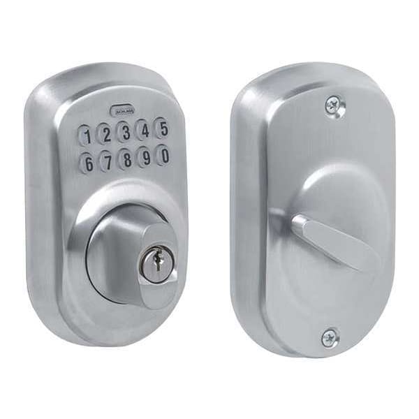 Electronic Keyless Lock, Function Auxiliary with Key Override, Access Method Keypad, Mounting Style Cylindrical, Lock Material Nickel Silver, Finish Satin Chrome, Series BE, Handle Type None, Door Thickness 1-3/8 in to 1-3/4 in, Key Override Options 5 Pin Tumbler C Keyway, Hand Nonhanded, Outside Height 5 1/2 in, Outside Width 3 in, Outside Depth 2 1/2 in, Keypad Material Silicone Rubber, Power Source 9V Battery, Battery Life 3 yr, Max. User Codes 10,000, Grade 2