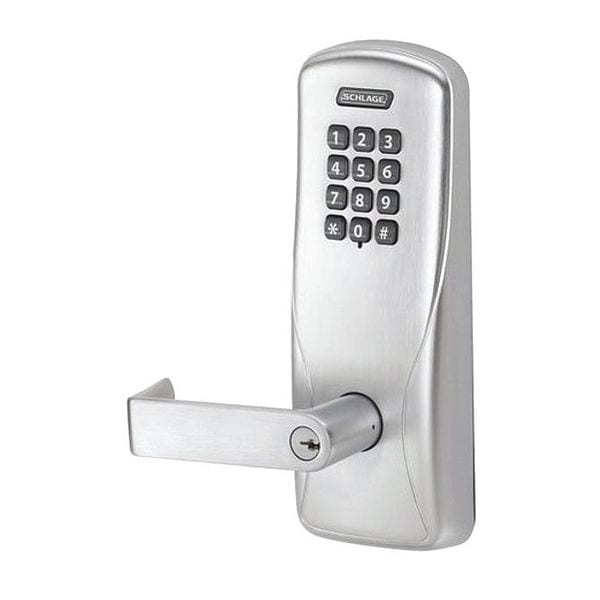 Electronic Keyless Lock, Function Classroom/ Storeroom, Access Method Keypad, Mounting Style Cylindrical, Lock Material Metal, Finish Satin Chrome, Series CO200, Handle Type Lever, Door Thickness 1-3/4 in, Key Override Options Schlage 6 Pin Everest 29 S123 Keyway, Hand Field Reversible, Outside Height 9 15/32 in, Outside Width 3 29/64 in, Outside Depth 3 43/64 in, Keypad Material Rubber, Power Source (4) AA Batteries, Battery Life Up to 2 yr, Operating Temp. Range -31 Degrees to 151 Degrees F