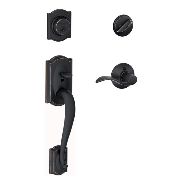 The Schlage Camelot handle set with accent lever in aged bronze is perfect for use on exterior front doors. The accent lever is widely popular for its elegant wave-like design that effortlessly matches a room's style without overshadowing it, while the Camelot handle set's scalloped architectural details make any room charming and approachable. the aged bronze finish is inspired by traditional design, featuring warm, copper tones that break through its darker, aged exterior. Plus, it's been designed and tested with strength and durability in mind.