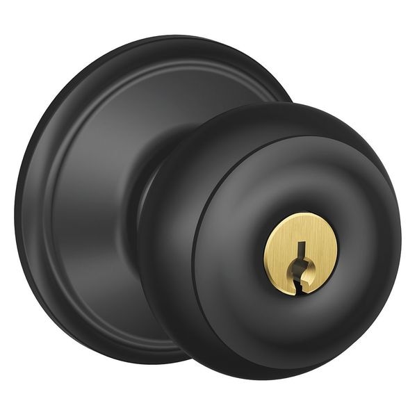 Residential Knob Lock, Lockset Function Entrance, Style Georgian, Matte Finish, Not Rated Fire Rated, Strike Type Round Corner Full Lip Strike, Strike Dim. 1-5/8 In. x 2-1/4 In., Grade 2, Series F, Backset 2-3/8 In. and 2-3/4 In., Pins 5, Number of Keys 2, Key Material Brass, Keying Keyed Different, Keyway Type C, Required Door Thickness 1-3/8 In. and 1-3/4 In., For Use With Residential/Light Commercial Applications, Includes Strike, Latch and Mounting Hardware, Standards ANSI/BHMA A156.2, 2011