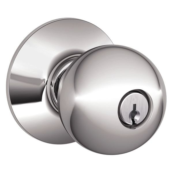 Residential Knob Lock, Lockset Function Entrance, Style Orbit, Polished Chrome Finish, Not Rated Fire Rated, Strike Type Round Corner Full Lip Strike, Strike Dim. 1-5/8 In. x 2-1/4 In., Grade 2, Series F, Backset 2-3/8 In. and 2-3/4 In., Pins 5, Number of Keys 2, Key Material Brass, Keying Keyed Different, Keyway Type C, Required Door Thickness 1-3/8 In. and 1-3/4 In., For Use With Residential/Light Commercial Applications, Includes Strike, Latch and Mounting Hardware
