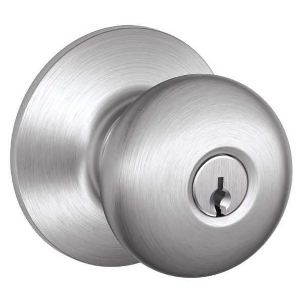 Knob Lockset, Medium Duty, Residential, Series F, Style Plymouth, Finish Satin Chrome, Function Entry, Keyway Type C, Grade 2, Material Brass/Steel/Zinc, For Door Thickness 1-3/8 - 2 In, Backset 2-3/8, 2-3/4 In, Crossbore Size 2-1/8 In, Key Type Nickel Silver, Number of Keys 2, Pins 5, Strike Square Corner, T-strike, Required Door Thickness 1-3/8 - 2 In, Keying Keyed Different (KD), Standards ANSI A156.5, 2001, Fire Rated 3 hr., Includes Hardware