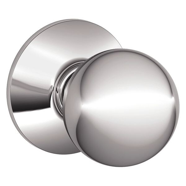 Residential Knob Lock, Lockset Function Passage, Style Orbit, Polished Chrome Finish, Not Rated Fire Rated, Strike Type Round Corner Full Lip Strike, Strike Dim. 1-5/8 In. x 2-1/4 In., Grade 2, Series F, Backset 2-3/8 In. and 2-3/4 In., Required Door Thickness 1-3/8 In. and 1-3/4 In., For Use With Residential/Light Commercial Applications, Includes Strike, Latch and Mounting Hardware, Standards ANSI/BHMA A156.2, 2011