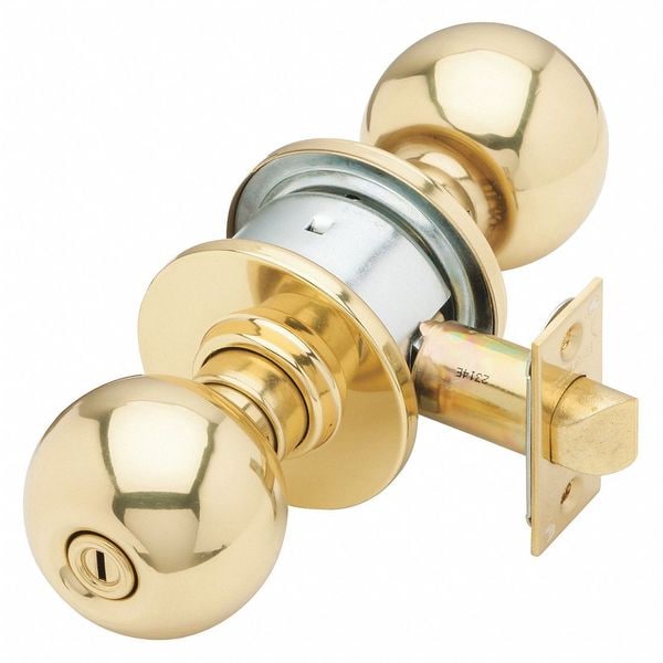 Knob Lockset, Medium Duty, Commercial, Series A, Style Orbit, Finish Polished Brass, Function Privacy, Keyway Type C123, Grade 2, Material Brass/Steel/Zinc, For Door Thickness 1-3/8 to 1-7/8 In, Backset 2-3/8 In, Crossbore Size 2-1/8 In, Key Type Nickel Silver, Number of Keys 2, Pins 6, Strike Square Corner, T-strike, Box, Required Door Thickness 1-3/8 to 1-7/8 In, Keying Keyed Different (KD), Standards ANSI/BHMA Certified A156.2-2003, Fire Rated 3 hr., Includes Hardware