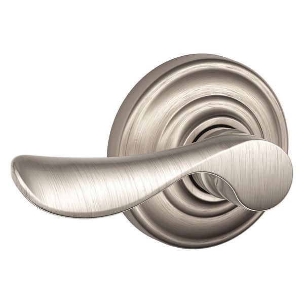 Door Lever Lockset, Light Duty, Lockset Function Passage, Style Champagne, Mechanical, Satin Nickel Finish, Strike Type Round Corner Full Lip Strike, Strike Dim. 1-5/8 In. x 2-1/4 In., Grade 2, Series F, Backset 2-3/8 In. and 2-3/4 In., Required Door Thickness 1-3/8 In. to 1-3/4 In., For Use With Residential/Light Commercial Applications, Includes Latch, Strike and Mounting Hardware, Standards ANSI-BHMA A156.2, 2011