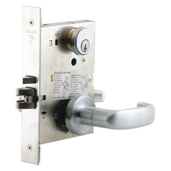 Mortise Lockset, Rose, Commercial, Series L, Style 17A, Finish Satin Chrome, Function Storeroom, Keyway Type C123, Grade 1, Material Brass/Steel/Zinc, For Door Thickness 1-3/4 In, Backset 2-3/4 In, Crossbore Size 4 In, Key Type Nickel Silver, Number of Keys 2, Pins 6, Strike Square Corner, Required Door Thickness 1-3/4 In, Keying Keyed Different (KD), Standards ANSI/BHMA Certified A156.13-2005, Fire Rated 3 hr., Includes Hardware