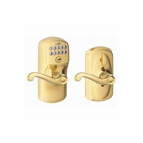 The Schlage Flair Keypad Lever with Plymouth Trim in Bright Brass is perfect for use on front doors, garage entry doors, and side and back doors With a keypad lever, you can control entry to your home more easily and securely, and our FlexLock feature allows you to set the lock to automatically relock after 5 seconds of inactivity No more hiding keys under the doormat or losing track of copies, just use access codes that can be created or deleted in seconds The elegant Flair lever's ornate details are reminiscent of a paper scroll, while the Plymouth trim features an oval shape and straightforward design The lock looks especially classic when finished in Bright Brass Plus, it's been designed and tested with strength and durability in mind
