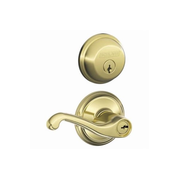 Bright Brass, Single Cylinder Deadbolt Flair Lever Combo Pack, Keyed Alike Entry Locks 1 Throw Deadbolt, Furnished With 4 Keys, Deadbolt Entry Keyed Alike, Universal Backset, Dual Option Latch, Radius Corner Drive In, ANSI, Grade 2, Visual Pack
