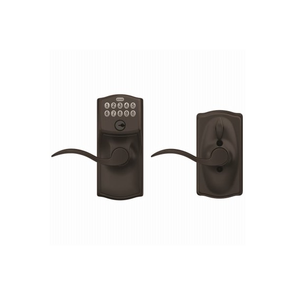 The Schlage Accent Keypad Lever with Camelot Trim in Aged Bronze is perfect for use on front doors, garage entry doors, and side and back doors With a keypad lever, you can control entry to your home more easily and securely, and our Flexlock feature allows you to set the lock to automatically relock after 5 seconds of inactivity No more hiding keys under the doormat or losing track of copies, just use access codes that can be created or deleted in seconds The Accent lever is widely popular for its elegant wavelike design that effortlessly matches a home's style without overshadowing it, while the Camelot trim's scalloped architectural details add charm to any home Our Aged Bronze finish is inspired by traditional design, featuring warm, copper tones that break through its darker, aged exterior Plus, it's been designed and tested with strength and durability in mind