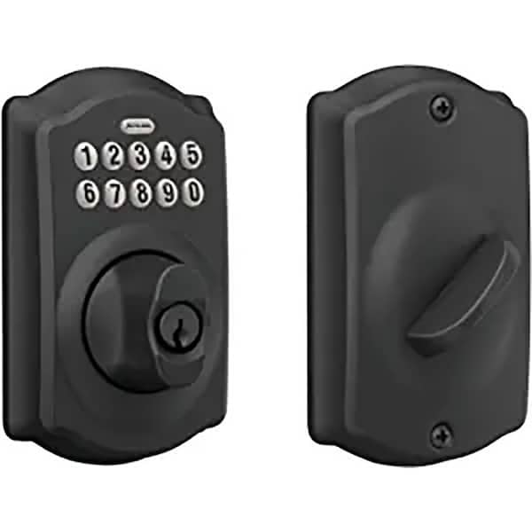 Keypad deadbolt with Camelot trim in matte black.