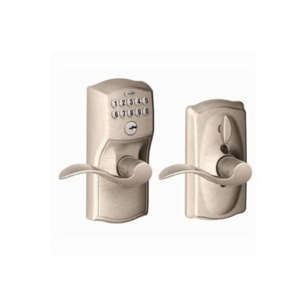 The Schlage Accent Keypad Lever with Camelot Trim in Satin Nickel is perfect for use on front doors, garage entry doors, and side and back doors With a keypad lever, you can control entry to your home more easily and securely, and our Flexlock feature allows you to set the lock to automatically relock after 5 seconds of inactivity No more hiding keys under the doormat or losing track of copies, just use access codes that can be created or deleted in seconds The Accent lever is widely popular for its elegant wavelike design that effortlessly matches a home's style without overshadowing it, while the Camelot trim's scalloped architectural details add charm to any home, especially when wrapped in our versatile Satin Nickel finish Plus, it's been designed and tested with strength and durability in mind