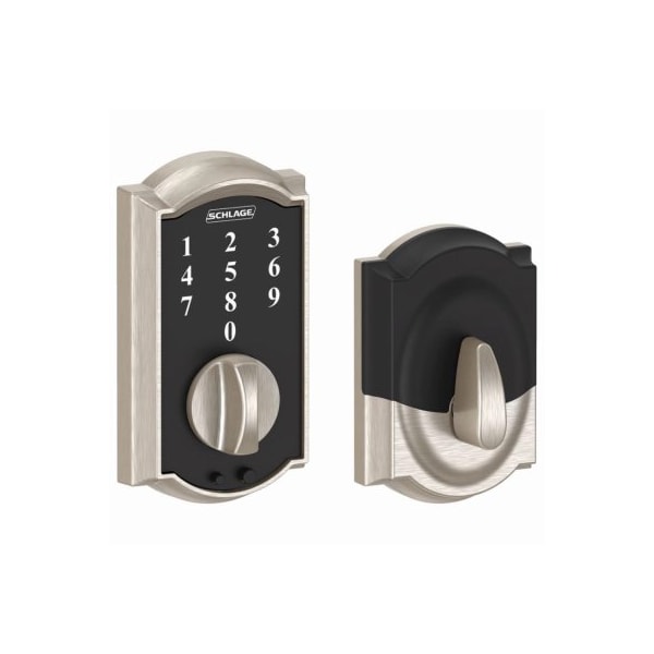 With the Satin Nickel Schlage Touch Keyless Touchscreen Deadbolt with Camelot Trim, there's no key to lose, no rekeying or cutting new keys, no keys at all, thanks to our cylinderfree design The Camelot trim's scalloped architectural details make any room charming and approachable, especially when wrapped in our versatile Satin Nickel finish Plus, it's been designed and tested with strength and durability in mind