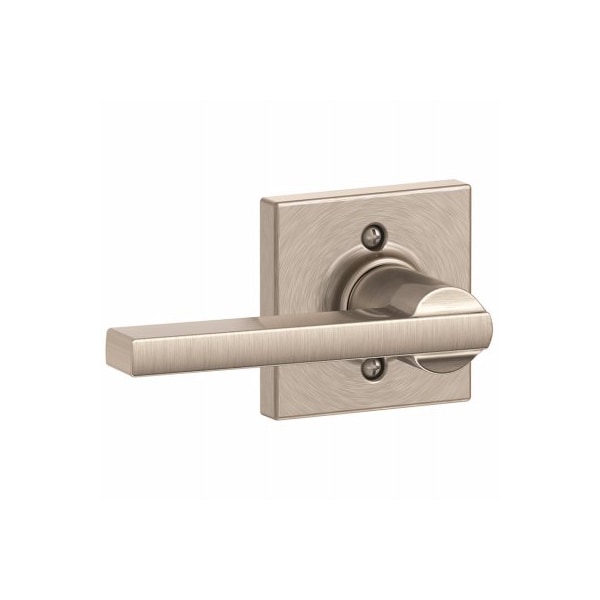 Satin Nickel, Latitude Collins NonTurning Dummy Lever, Commonly Used As A Decorative Pull For Doors That Don't Require Latching, The Latitude Lever Offers A Crisp Perspective On Minimalist Design With Its Clean Lines Rectangular Features, Strong Lines Square Shape Embody Refined Elegance, Designed Tested With Strength Durability