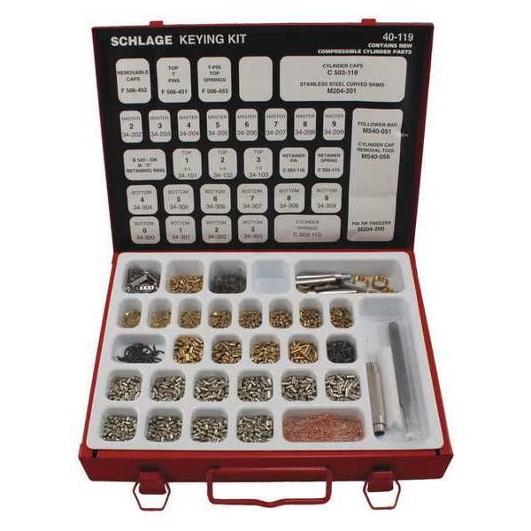 Pinning Kit, For Use With Lockset Cylinders, Material Steel, Standards ANSI, Includes Bottom Pins, Cap Pin Springs, Cap Pins, Cap Removal Tool, Caps, Follower, Key Gauge, Shims, Springs, Top and Master Pins, Tweezers