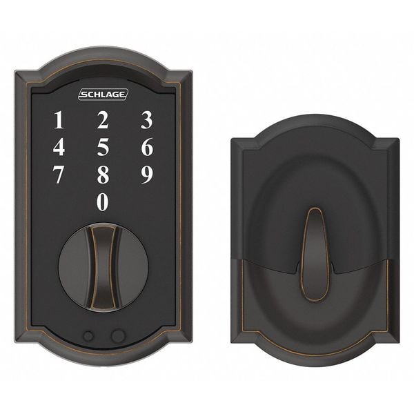 Electronic Keyless Lock, Function Entry, Access Method Touch Screen Keypad, Mounting Style Cylindrical, Lock Material Zinc Alloy, Finish Antique Bronze, Series BE375, Handle Type Deadbolt, Door Thickness 1-3/8 in to 1-3/4 in, Key Override Options None, Hand Field Reversible, Network Interface None, Keypad Material Zinc, Power Source 9V Battery, Battery Life 1 to 2 yr, Max. User Codes 19, Fire Rating Not Rated, ADA Compliant No, Grade 2, Standards ANSI/BHMA A156.36-2010, ANSI/BHMA A156.40-2015