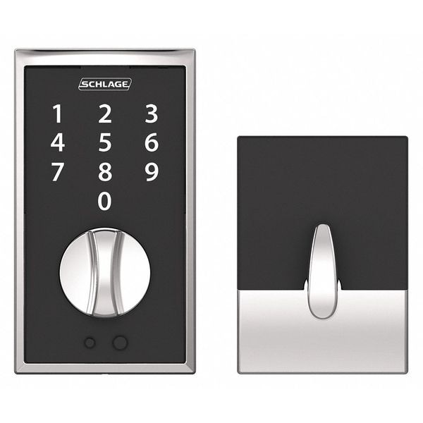 Electronic Keyless Lock, Function Entry, Access Method Touch Screen Keypad, Mounting Style Cylindrical, Lock Material Zinc Alloy, Finish Bright Chrome, Series BE375, Handle Type Deadbolt, Door Thickness 1-3/8 in to 1-3/4 in, Key Override Options None, Hand Field Reversible, Network Interface None, Keypad Material Zinc, Power Source 9V Battery, Battery Life 1 to 2 yr, Max. User Codes 19, Fire Rating Not Rated, ADA Compliant No, Grade 2, Standards ANSI/BHMA A156.36-2010, ANSI/BHMA A156.40-2015