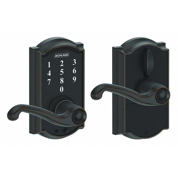 Electronic Keyless Lock, Function Entry, Access Method Touch Screen Keypad, Mounting Style Cylindrical, Lock Material Zinc Alloy, Finish Antique Bronze, Series FE695, Handle Type Lever, Door Thickness 1-3/8 in to 1-3/4 in, Key Override Options Schlage In.C In. 6 Pin Keyway, Hand Field Reversible, Network Interface None, Keypad Material Zinc, Power Source 9V Battery, Battery Life 1 to 2 yr, Max. User Codes 19, Fire Rating Not Rated, ADA Compliant No, Grade 2