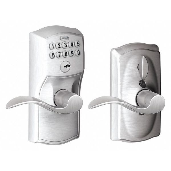 Electronic Keyless Lock, Function Entry, Access Method Keypad, Mounting Style Cylindrical, Lock Material Zinc Alloy, Finish Satin Chrome, Series FE595, Handle Type Lever, Door Thickness 1-3/8 in to 1-3/4 in, Key Override Options 5 Pin Tumbler C Keyway, Hand Field Reversible, Network Interface None, Keypad Material Zinc, Power Source 9V Battery, Battery Life 1 to 2 yr, Max. User Codes 19, Fire Rating Not Rated, ADA Compliant No, Grade 2, Standards ANSI/BHMA A156.2-2011 Grade 2