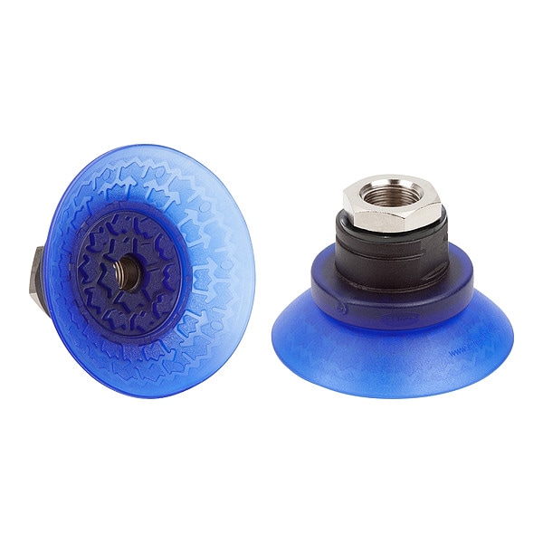 Item Vacuum Pad Assembly, Durometer 85 A, For Use With Handling Sheet Metal, Number of Folds 0, Outside Diameter 50 mm, Overall Height 51.4 mm, Pad Color Blue, Pad Diameter 58.4 mm, Hardness 85 Shore A, Pad Height 36.4 mm, Pad Material Elastodur ED, Pad Type Deep, Port Size 1/4 in, Port Type G, Series SAX, Stroke 8.4 mm, Weight 39.5 g