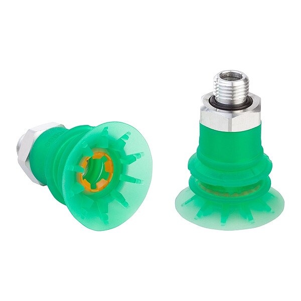 Item Vacuum Pad Assembly, Durometer 55 A, For Use With Packaging Industry, Number of Folds 2.5, Outside Diameter 40 mm, Overall Height 54.5 mm, Pad Color Green, Pad Diameter 42 mm, Hardness 55 Shore A, Pad Height 44.5 mm, Pad Material Food Grade Silicone Rubber, Pad Type Multi-Bellows, Port Size 1/4 in, Port Type G, Series SPB2F, Stroke 7 mm, Weight 23.2 g