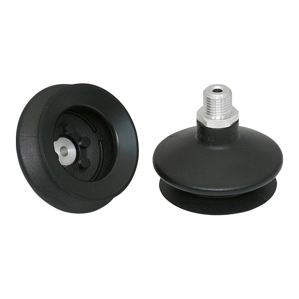 Item Vacuum Pad Assembly, Adapter Material Aluminum, Durometer 55 A, Maximum Vacuum Pressure -0.6 bar, Number of Folds 1.5, Outside Diameter 53 mm, Overall Height 49 mm, Pad Color Black, Pad Diameter 60 mm, Hardness 55 Shore A, Pad Height 38 mm, Pad Material NBR, Pad Type Bellows, Port Size 1/4 in, Port Type G, Series FSGA, Standards DIN ISO 3302-1 M3, Stroke 15 mm, Weight 27 g