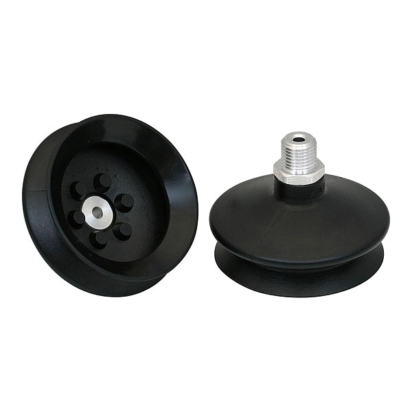 Item Vacuum Pad Assembly, Adapter Material Aluminum, Durometer 55 A, Maximum Vacuum Pressure -0.6 bar, Number of Folds 1.5, Outside Diameter 63 mm, Overall Height 49 mm, Pad Color Black, Pad Diameter 68 mm, Hardness 55 Shore A, Pad Height 38 mm, Pad Material NBR, Pad Type Bellows, Port Size 1/4 in, Port Type G, Series FSGA, Standards DIN ISO 3302-1 M3, Stroke 15 mm, Weight 34 g