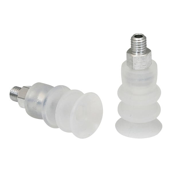 Item Vacuum Pad Assembly, Adapter Material Aluminum, Durometer 55 A, Maximum Vacuum Pressure -0.6 bar, Number of Folds 2.5, Outside Diameter 14 mm, Overall Height 32.8 mm, Pad Color Clear, Pad Diameter 15.5 mm, Hardness 55 Shore A, Pad Height 27.8 mm, Pad Material Food Grade Silicone Rubber, Pad Type Multi-Bellows, Port Size M5, Port Type Metric, Series FSG, Standards DIN ISO 3302-1 M3, FDA Approved, Stroke 9 mm, Weight 2.6 g