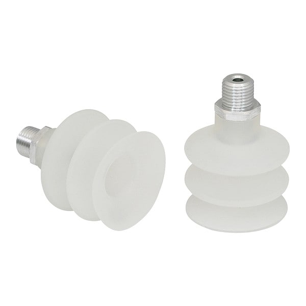 Item Vacuum Pad Assembly, Adapter Material Aluminum, Durometer 55 A, Maximum Vacuum Pressure -0.6 bar, Number of Folds 2.5, Outside Diameter 42 mm, Overall Height 61 mm, Pad Color Clear, Pad Diameter 45 mm, Hardness 55 Shore A, Pad Height 50 mm, Pad Material Food Grade Silicone Rubber, Pad Type Multi-Bellows, Port Size 1/4 in, Port Type G, Series FSG, Standards DIN ISO 3302-1 M3, FDA Approved, Stroke 20 mm, Weight 27 g