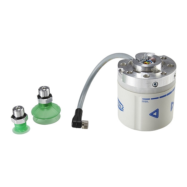 Item Cobotic Integration Kit, Application Bin Picking, Pneumatic Handling of Airtight Workpieces, Compatible With Omron, Current Rating 0.30 A, Electrical Connection M8 8-Pole Female Elbow Connector, Includes (1) Bellows Suction Cup SPB1-30, (1) MiniCobotPump ECBPMi, (1) Mounting Flange, (1) Positioning Pin, (2) Flat Suction Cup SFF-20, (4) Screws, Includes Adapter Plate Adapter Plate Included, Includes Cable Cable Included, Maximum Flow Rate 1.6 lpm, Number of Pads 2, Output Power 7.2 W