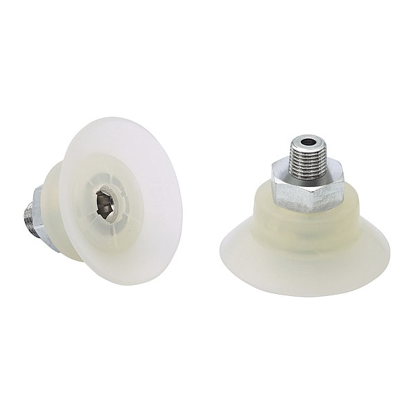 Item Vacuum Pad Assembly, Durometer 55 A, Maximum Vacuum Pressure -0.6 bar, Number of Folds 0, Outside Diameter 40 mm, Overall Height 30.7 mm, Pad Color Clear, Pad Diameter 44 mm, Hardness 55 Shore A, Pad Height 23.2 mm, Pad Material Food Grade Silicone Rubber, Pad Type Flat, Port Size 1/8 in, Port Type NPT, Series SUF, Standards FDA Approved, Stroke 4 mm, Weight 17.1 g
