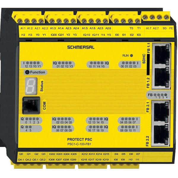 Safety controllers, PSC1-C-100-FB1, Memory card, Expandable with safe remote IO modules, Safe cross communication between up to 4 master controllers, conversion of the field bus protocols by software, integrated SD-Bus-Gateway, Modularly expandable to up to 272 safe inputs / outputs, Safe spindle monitoring To EN 61800-5-2 (Safe Drive Monitoring) for up to 12 spindles, 4 safe 2 A pp-switching semiconductor outputs, switchable to 2 safe p- / n-switching semiconductor outputs, 14 safe inputs on the base module, 20 switchable, safe inputs / outputs, 6 Signalling outputs, 2 safety relay contacts