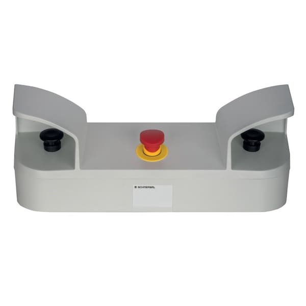 Two-hand control panels, 101027371, Thermoplastic enclosure, 2 black operating buttons (positioning parts) Dia. 55, 1 Emergency Stop button in thermoplastic version, Stand and wall mounting possible, 2 part enclosure