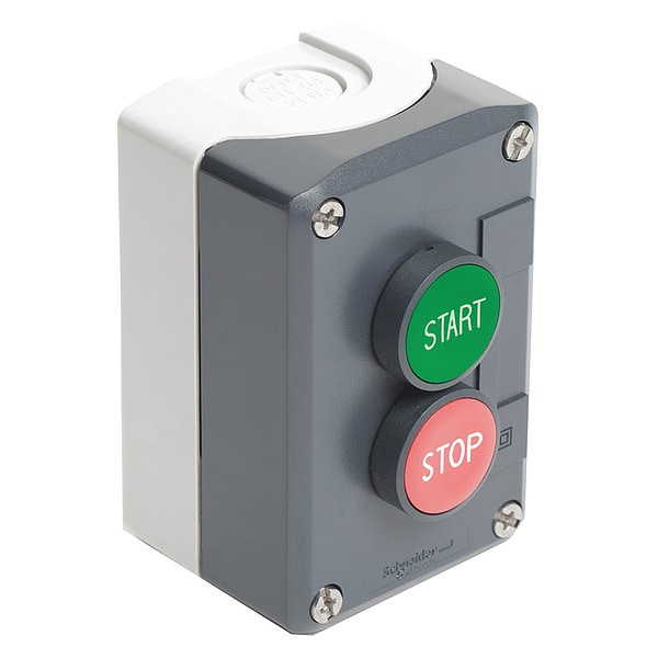 Complete control station, Harmony XALD, XALK, dark grey, flush push buttons 22mm, green START 1NO red STOP 1NC, spring return