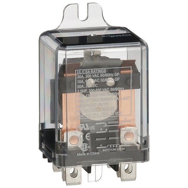 Enclosed Power Relay, Base Shape Square, Coil Voltage 24V DC, Contact Form SPDT, Current Rating 25 A, Electrical Connection Quick-Connect, Number of Pins 5, Status Indicator Mechanical Flag, Contact Rating (AC) 20 A @ 277V, 22 A @ 120V, 25 A @ 250/300V, 5 A @ 600V, Contact Rating (DC) 13 A @ 28V, 15 A @ 28V, Horsepower @ 120V AC 1 hp, Horsepower @ 240V AC 1 1/2 hp, Mounting Style Flange, Body Depth 1.4 in, Body Height 2.66 in, Body Width 1.4 in, Coil Resistance 400 ohm