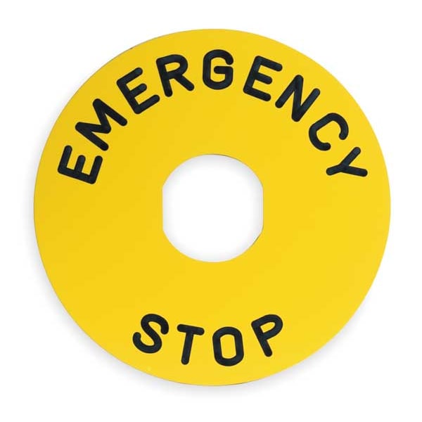 Legend Plate, Round, Legend Emergency Stop, For Use With 22mm Pushbuttons, Legend/Background Color Black/Yellow, Material Plastic, Height 3.54 in, Width 3.54 in, Diameter 90 mm