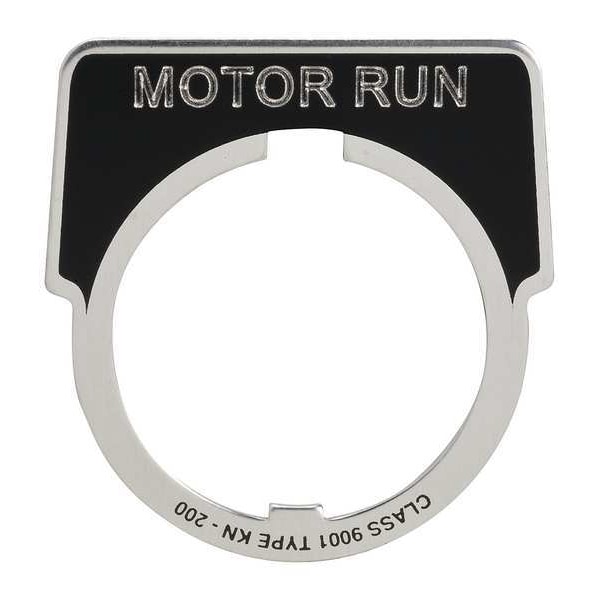 Legend Plate, Half-Round, Legend Motor Run, For Use With 30mm 9001K Operators, Legend/Background Color Black, Material Aluminum, Height 1.9 in, Width 2.3 in