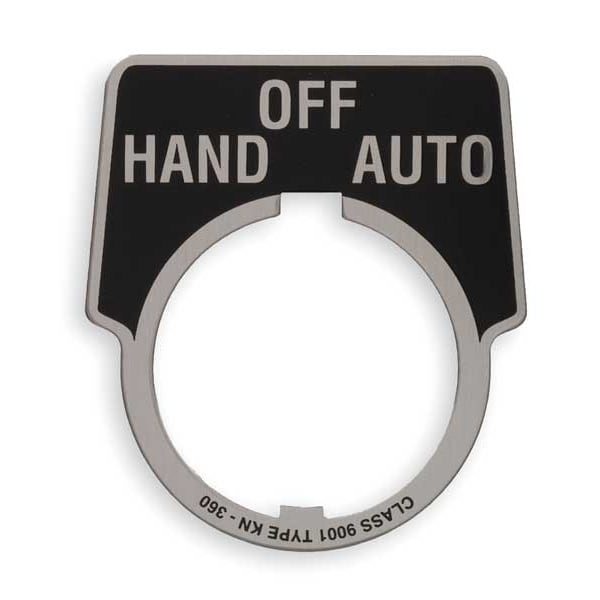 Legend Plate, Half-Round, Legend Hand-Off-Auto, For Use With 30mm 9001K Operators, Legend/Background Color Black, Material Aluminum, Height 1.9 in, Width 2.3 in