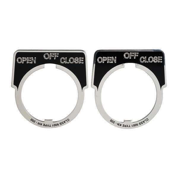 Legend Plate, Half-Round, Legend Open-Off-Close, For Use With 30mm 9001K Operators, Legend/Background Color Black, Material Aluminum, Height 1.9 in, Width 2.3 in