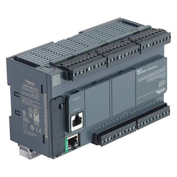 PLC, Input Voltage 24V AC/DC, Output Type (16) Transistor, 0.5 A Amps, 2 Slots, Number of Inputs 24, Number of Outputs 16, Counters 4, Timers Programmable, Yes Clock, 7 Segment LED Display, Port Type Ethernet(10/100 mbps), Modbus Serial (1xRJ45 - RS232/RS485), SD Card, USB Mini (Prog.), Memory 256 KB, Depth 3 in, Height 4.17 in, Width 6.42 in