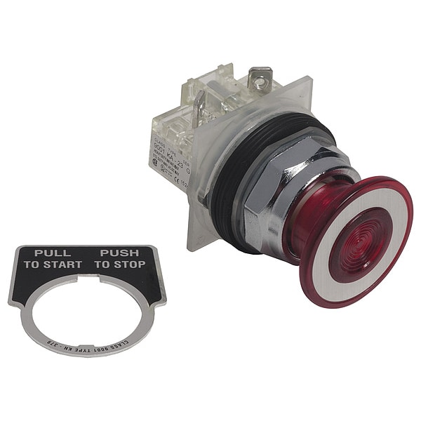 Mushroom Head Push Button, 30 mm, Maintained Action, Head Material Metal, Contact Form 1NC, Bezel Chrome Plated Metal, Contact Rating 10A @ 600V AC, NEMA Contact Rating Designation A600/Q600, Number of Operators 1, NEMA Rating 1, 12, 13, 2, 3, 3R, 4, IP Rating IP66, Legend Pull to Start, Push to Stop, Legend/Background Color Gray/Black, Standards CSA C22.2 No.14, EN/IEC 60947-1, EN/IEC 60947-5-1, EN/IEC 60947-5-4, JIS C4520, JIS C852, REACH, RoHS, UL 508, WEEE, Terminal Connection Screw Clamp