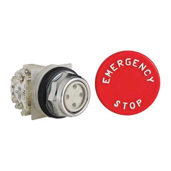 Mushroom Head Push Button, 30 mm, Momentary Action, 57mm Mushroom Head Type of Operator, Head Material Plastic, Contact Form SPDT, Bezel Chrome Plated Zinc Die Cast, Color Red, Contact Rating 10A @ 600V AC, NEMA Contact Rating Designation A600/Q600, Number of Operators 1, NEMA Rating 1, 12, 13, 2, 3, 3R, 4, 6, IP Rating IP20, IP65, Legend Emergency Stop, Legend/Background Color White/Red, Standards CE, CSA LR25490 Class 3211 03, REACH, RoHS, UL E42259 CCN NKCR, WEEE