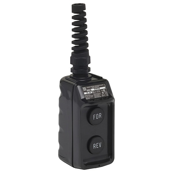 Pendant Control Station, Number of Operators 2, Number of Pilot Lights 0, Legend Forward/Reverse, Type of Operator Push Button, Contact Form 1NO/1NC, Mechanical Interlock Yes, NEMA Rating 1, 3, 3R, 4, 4X, NEMA Contact Rating Designation B600/P600, Hub 1/2 in NPT, Height 4.69 in, Width 2.19 in, Depth 2.94 in, Enclosure Color Black, Standards CE, CSA C22.2 No.14, EN/IEC 60947-1, EN/IEC 60947-5-1, EN/IEC 60947-5-4, JIS C4520, UL 508