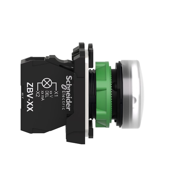 Pilot Light, Voltage 110 to 120V AC, Color White, Lamp Type LED, Shape Round, Terminal Connection Screw Clamp, Lens Material Plastic, 22 mm, Lamp Module Type Full Voltage, Basic Material Plastic, Lens Type Smooth, Body Material Plastic, NEMA Rating 13, 4, 4X, IP Rating IP66, IP67, IP69, IP69K, Includes Light Module and Head, Mounting Base, Standards CSA, REACH, RoHS, UL Listed, WEEE