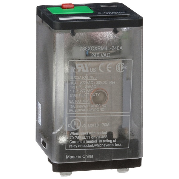 General Purpose Relay, Base Shape Square, Coil Voltage 240V AC, Contact Form 3PDT, Current Rating 10 A, Electrical Connection Blade Terminal, Flat Pin Width 0.189 in, Number of Pins 11, Pin Shape Flat, Sealing Enclosed, Status Indicator LED Indicator, Contact Rating (AC) 10 A @ 277V, 5 A @ 250V-1 (NC), Contact Rating (DC) 10 A @ 28V, Horsepower @ 120V AC 1/3 hp, Horsepower @ 240V AC 1/2 hp, Mounting Style Plug-In, Push-To-Test Method Lockable, Body Depth 2.09 in, Body Height 1.4 in
