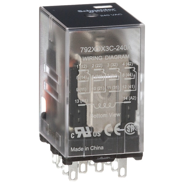 General Purpose Relay, Base Shape Square, Coil Voltage 240V AC, Contact Form 4PDT, Current Rating 3 A, Electrical Connection Faston Connector, Number of Pins 14, Status Indicator Mechanical Flag, Contact Rating (AC) 1.00 A @ AC-1 (NC), 2.00 A @ AC-1 (NO), 3 A @ 120/240/277V, Contact Rating (DC) 1 A @ DC-1 (NC), 2 A @ DC-1 (NO), 3 A @ 30V, Horsepower @ 120V AC 1/16 hp, Horsepower @ 240V AC 1/2 hp, Mounting Style Plug-In, Push-To-Test Method No Button, Body Depth 1.37 in, Body Height 1.07 in