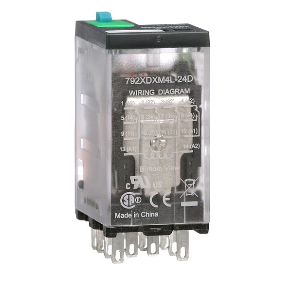 General Purpose Relay, Base Shape Square, Coil Voltage 24V DC, Contact Form 4PDT, Current Rating 6 A, Electrical Connection Faston Connector, Flat Pin Width 0.02 in, Number of Pins 14, Status Indicator LED Indicator, Mechanical Flag, Contact Rating (AC) 3 A @ AC-1 (NC), 6 A @ 277V, 6 A @ AC-1 (NO), 8 A @ 120V, Contact Rating (DC) 3 A @ DC-1 (NC), 6 A @ DC-1 (NO), 8 A @ 30V, Horsepower @ 120V AC 1/3 hp, Horsepower @ 240V AC 1/2 hp, Mounting Style Plug-In, Push-To-Test Method Lockable