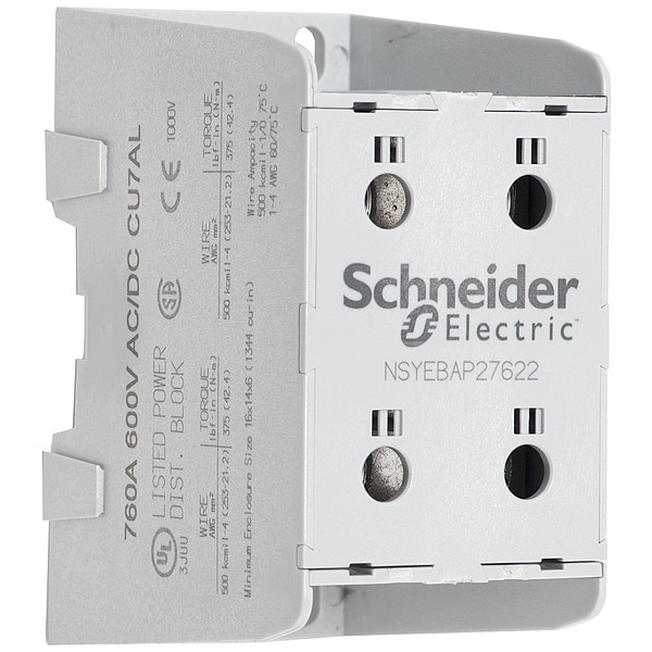 Power Distribution Block, For Conductor Material Aluminum, Copper, Line Connections/Pole 2, Line Side Stud Size Not Applicable, For Line Copper Wire Size - Minimum 4 AWG, For Line Copper Wire Size - Maximum 500 kcmil, Load Connections/Pole 2, Load Side Stud Size Not Applicable, For Load Copper Wire Size - Minimum 4 AWG, For Load Copper Wire Size - Maximum 500 kcmil, Maximum Current - Copper Conductor 760 A, Maximum Voltage 600 V, Mounting Type Surface, Number of Poles 1, Overall Depth 3.35 in