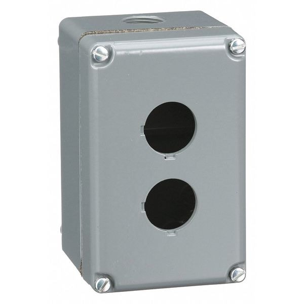 Push Button Enclosure, Number of Columns 1, Number of Holes 2, NEMA Rating 1, 13, 3, 4, Conduit Size No Conduit Entrance Holes Provided, Dimensions 5.75 in H x 3.63 in W x 3.53 in D, Hole Size 30 mm, Material Aluminum, Height 5.75 in, Width 3.63 in, Depth 3.53 in, Color Gray, Mounting Style Surface, Standards RoHS